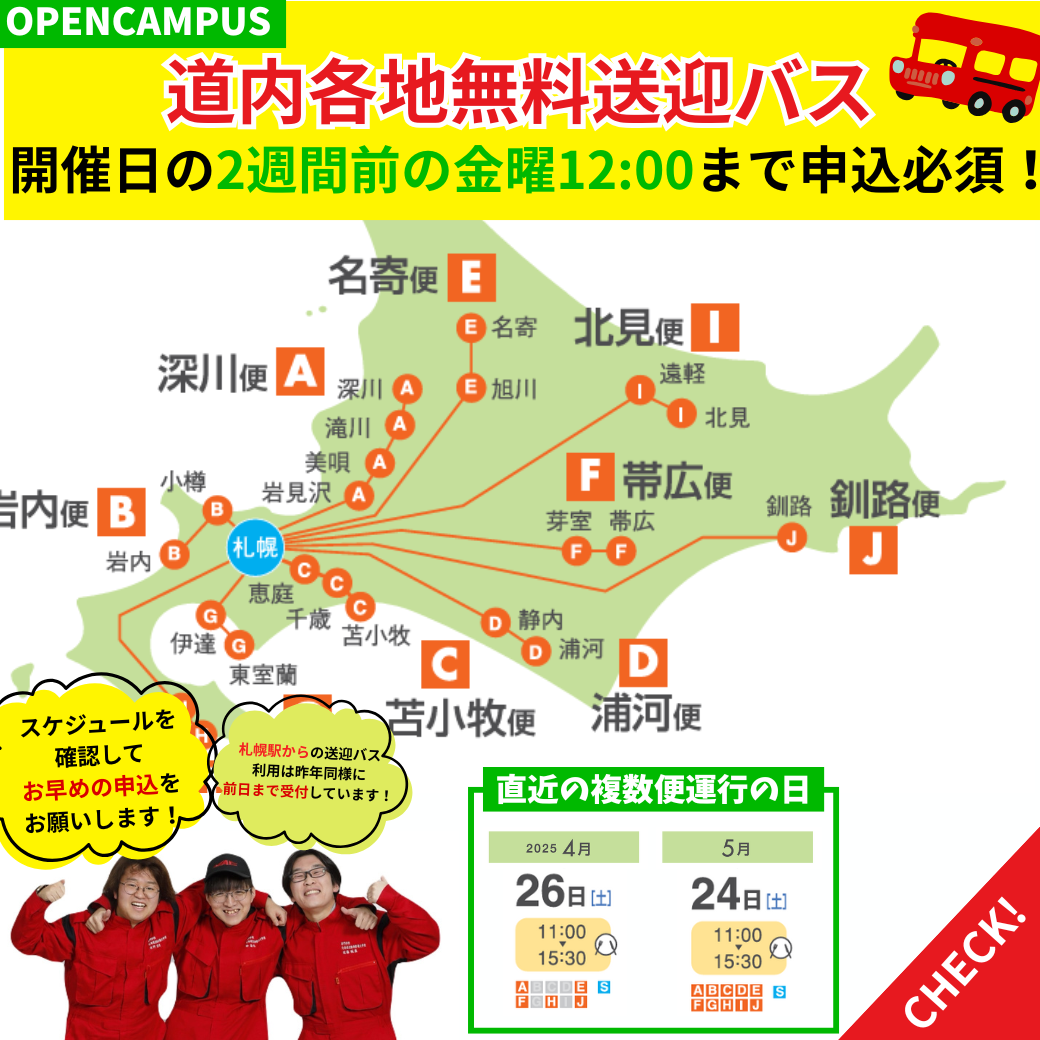 ※4/26オープンキャンパスの送迎バス申込は4/11(金)12:00締め切りとなります。