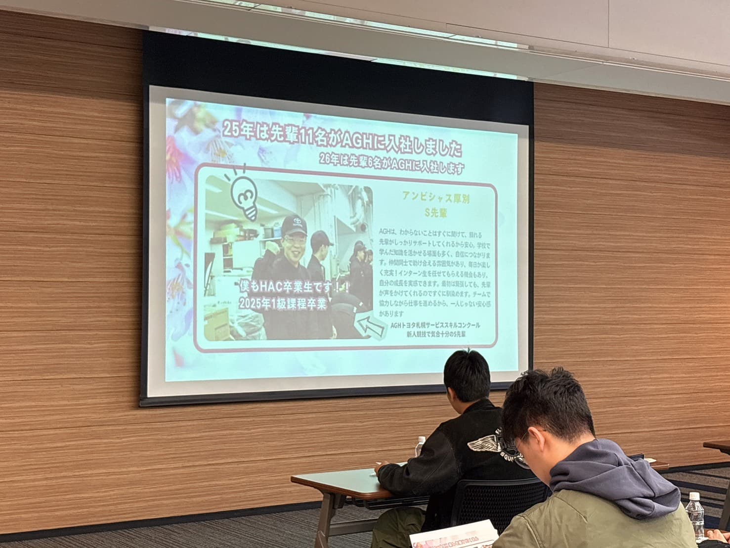 まずはAGHグループの概要をはじめ、AGHで働く整備職や福利厚生等をご説明をいただきました。\AGHさんで働くHAC卒業生のインタビュー記事の紹介もありました🌸/
