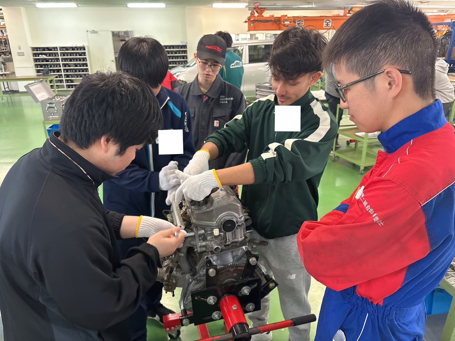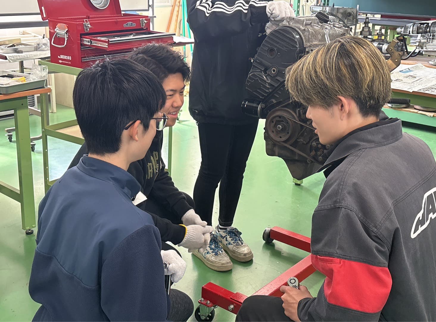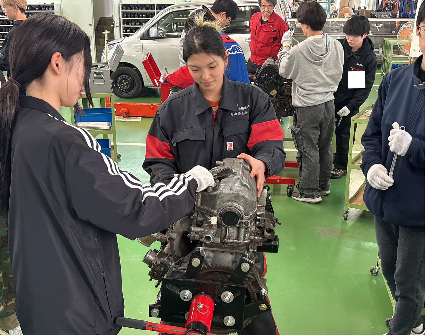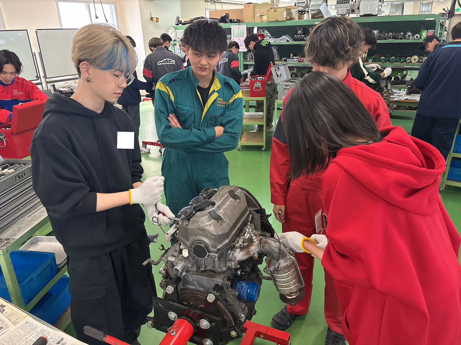 入学してすぐにやるこちらの実習。部品やパーツに触れながら、車が動く仕組みや構造の基礎を学ぶことができます🚗🚗
